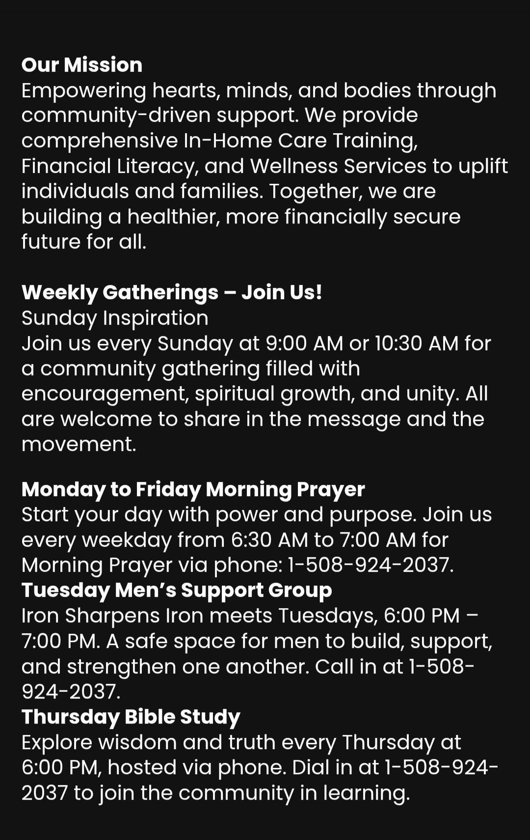 We offer a variety of services including Sunday Services, Men's Support Group, Bible Study, and Weekly Prayer sessions. Each program is designed to support spiritual development and community engagement.How can I get involved with the community?
